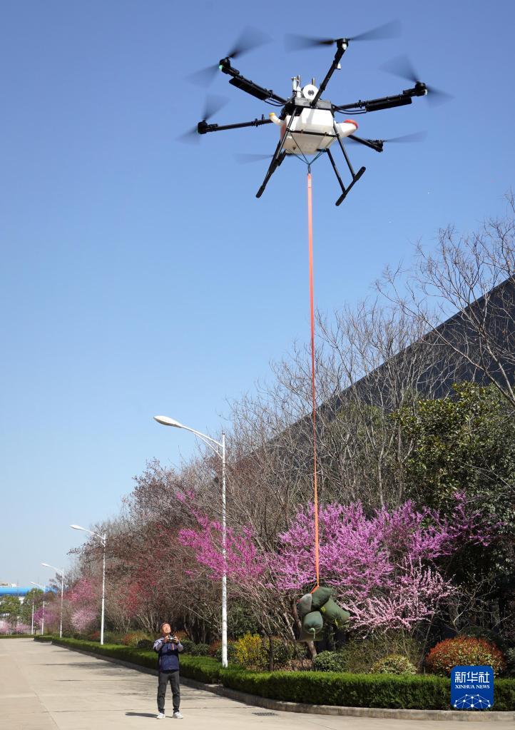 3月14日,在位于洛陽(yáng)市的生產(chǎn)車(chē)間外,楊世誼對無(wú)人機進(jìn)行吊裝載重測試。