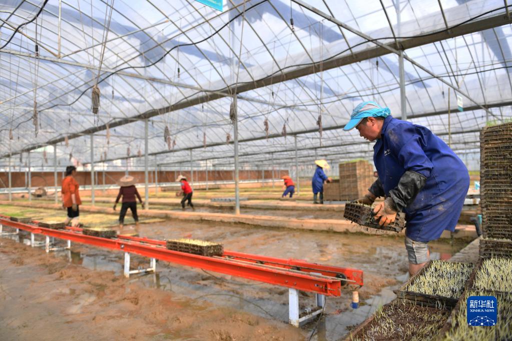 3月15日,在向陽(yáng)紅現代農業(yè)智能化集中育秧工廠(chǎng),農民將早稻秧盤(pán)放至循環(huán)運動(dòng)式育秧機上。