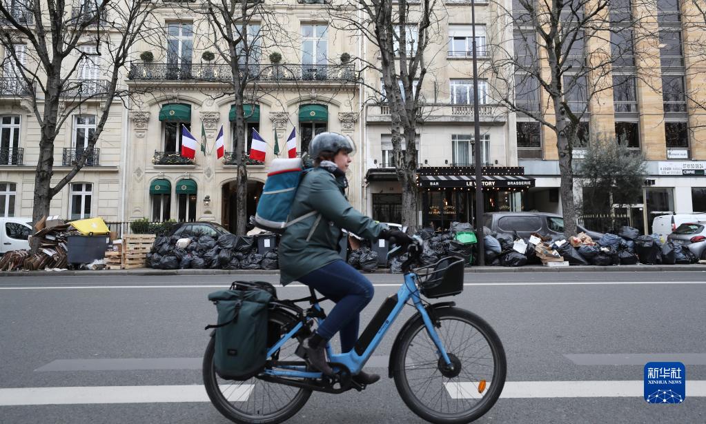 3月15日,一名女子騎車(chē)經(jīng)過(guò)法國巴黎街頭無(wú)人清理的垃圾。