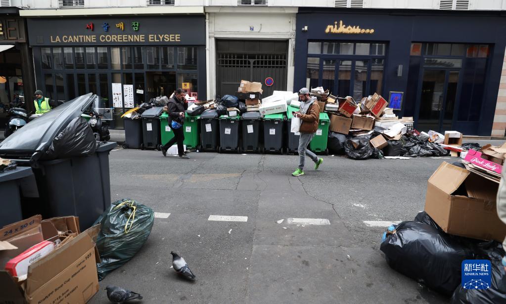 這是3月15日在法國巴黎市中心街頭拍攝的無(wú)人清理的垃圾。
