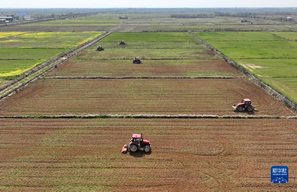 在江西省南昌縣大田農社,農民駕駛農機在稻田里耕作(3月15日攝,無(wú)人機照片)。