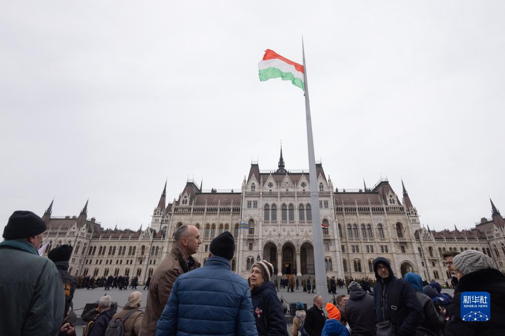 3月15日,人們在匈牙利首都布達佩斯國會(huì )大廈前的科蘇特廣場(chǎng)參加升國旗儀式。