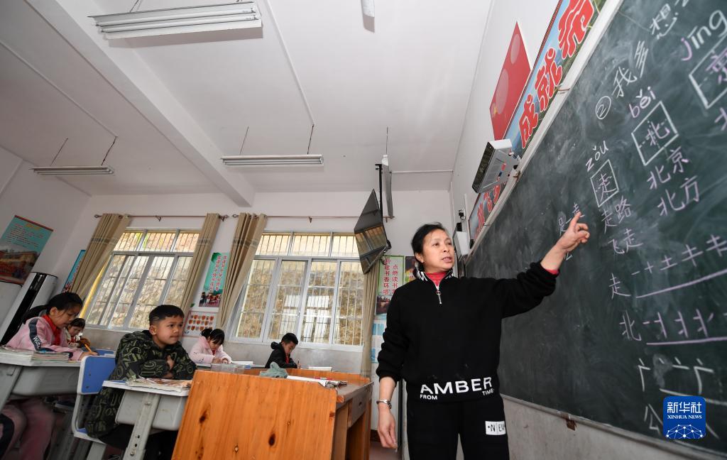 廣西金秀瑤族自治縣忠良鄉山界教學(xué)點(diǎn)的教師陶鳳英給學(xué)生上課(3月15日攝)。