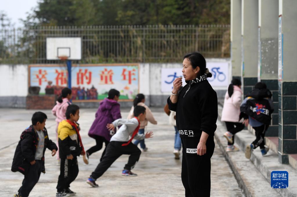 廣西金秀瑤族自治縣忠良鄉山界教學(xué)點(diǎn)的教師陶鳳英吹哨子催促學(xué)生進(jìn)教室上課(3月15日攝)。