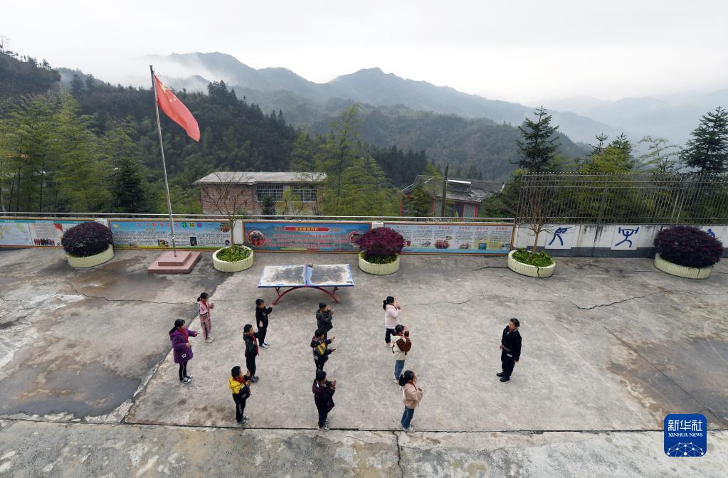 廣西金秀瑤族自治縣忠良鄉山界教學(xué)點(diǎn)的教師陶鳳英和學(xué)生一起做課間操(3月15日攝)。
