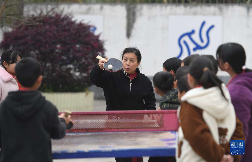 廣西金秀瑤族自治縣忠良鄉山界教學(xué)點(diǎn)的教師陶鳳英課間和學(xué)生打乒乓球(3月15日攝)。