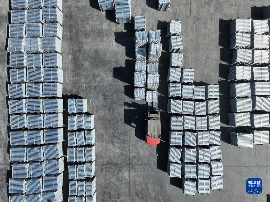 3月15日,在位于樂(lè )亭經(jīng)濟開(kāi)發(fā)區的華北易安德腳手架制造有限公司,叉車(chē)在搬運產(chǎn)品(無(wú)人機照片)。