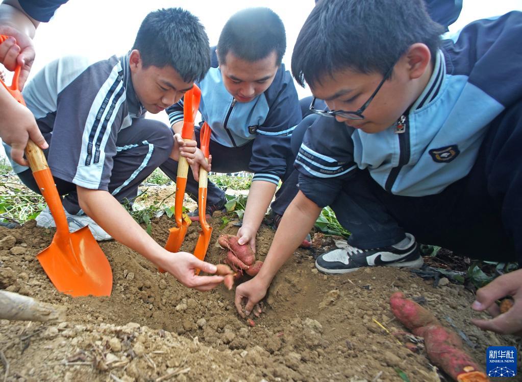 3月16日,孩子們在廣西南寧市江南區蘇圩鎮紅薯地里挖紅薯。