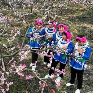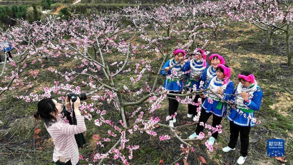 3月16日,游客在貴州省黔東南苗族侗族自治州錦屏縣大同鄉穩江村黃桃種植基地拍照(無(wú)人機照片)。