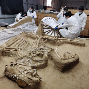 3月16日,在河北行唐故郡遺址考古實(shí)驗室,工作人員在對二號車(chē)馬坑的3號車(chē)進(jìn)行清理。