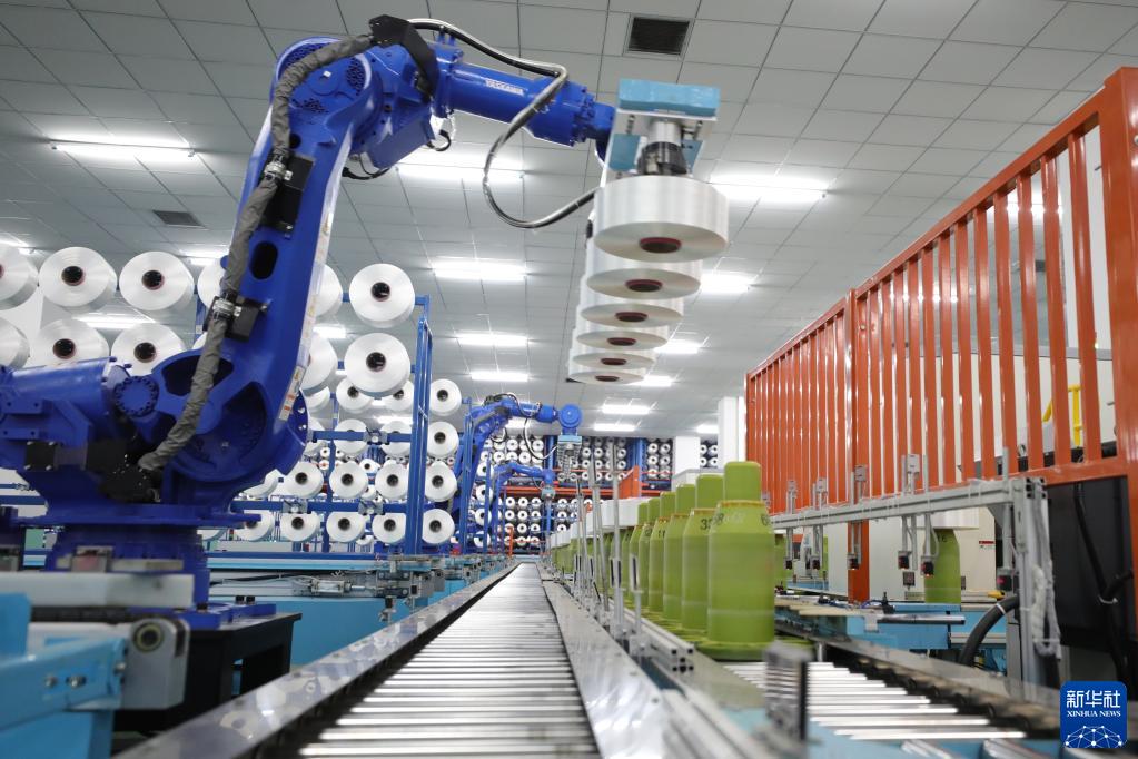 3月15日,在恒力(蘇州)產(chǎn)業(yè)園內的高性能滌綸工業(yè)絲智能車(chē)間內,機械手臂將檢驗合格的絲餅放上絲車(chē),轉運至智能立體倉庫。