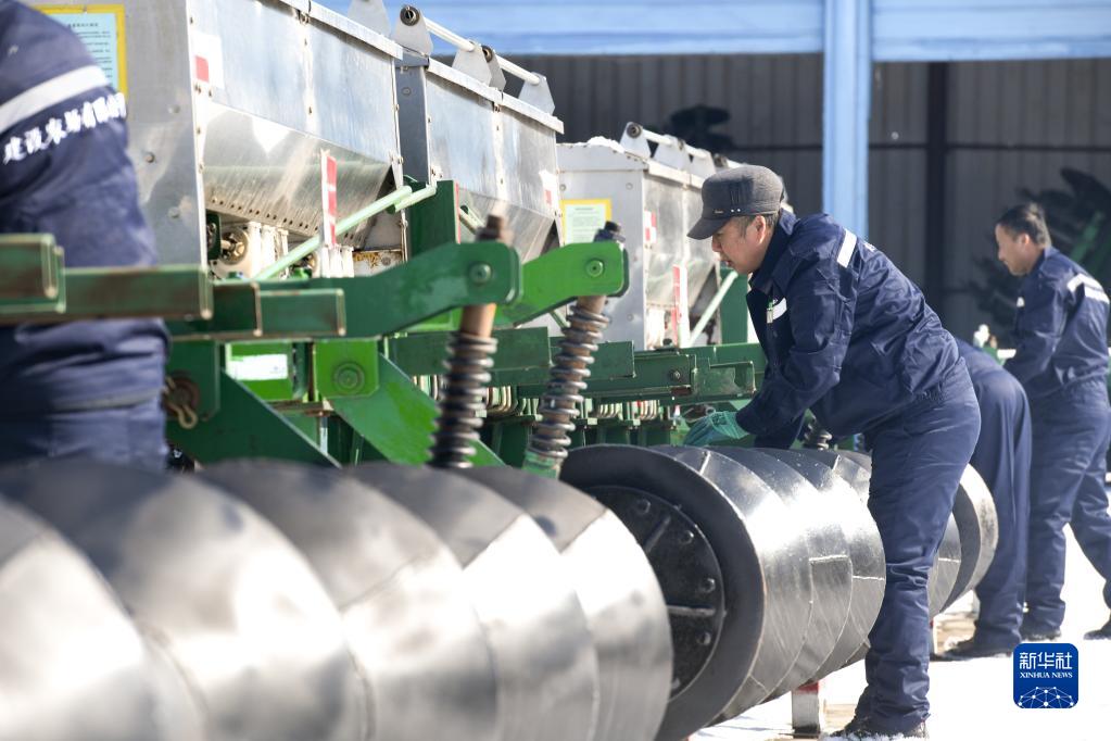 3月16日,在北大荒集團建設農場(chǎng)有限公司第四管理區,農機技術(shù)員在檢修農機具。
