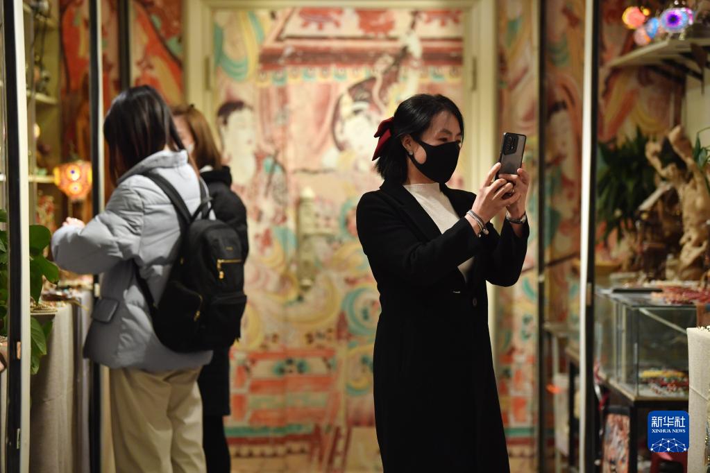 游客在敦煌夜市的一間店鋪里挑選商品(3月16日攝)。