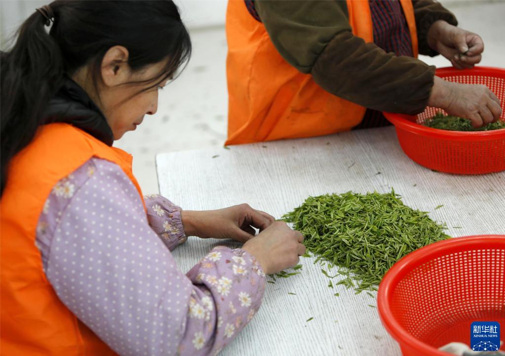 在蘇州市吳中區西山國家現代農業(yè)示范園金海華碧水緣茶葉基地,采茶工在挑選茶葉(3月16日攝)。