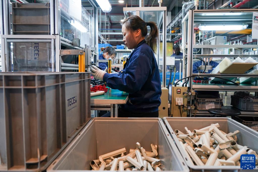 工人在位于太倉市高新區的帝希潔具系統(蘇州)有限公司生產(chǎn)車(chē)間內進(jìn)行加工作業(yè)(3月16日攝)。