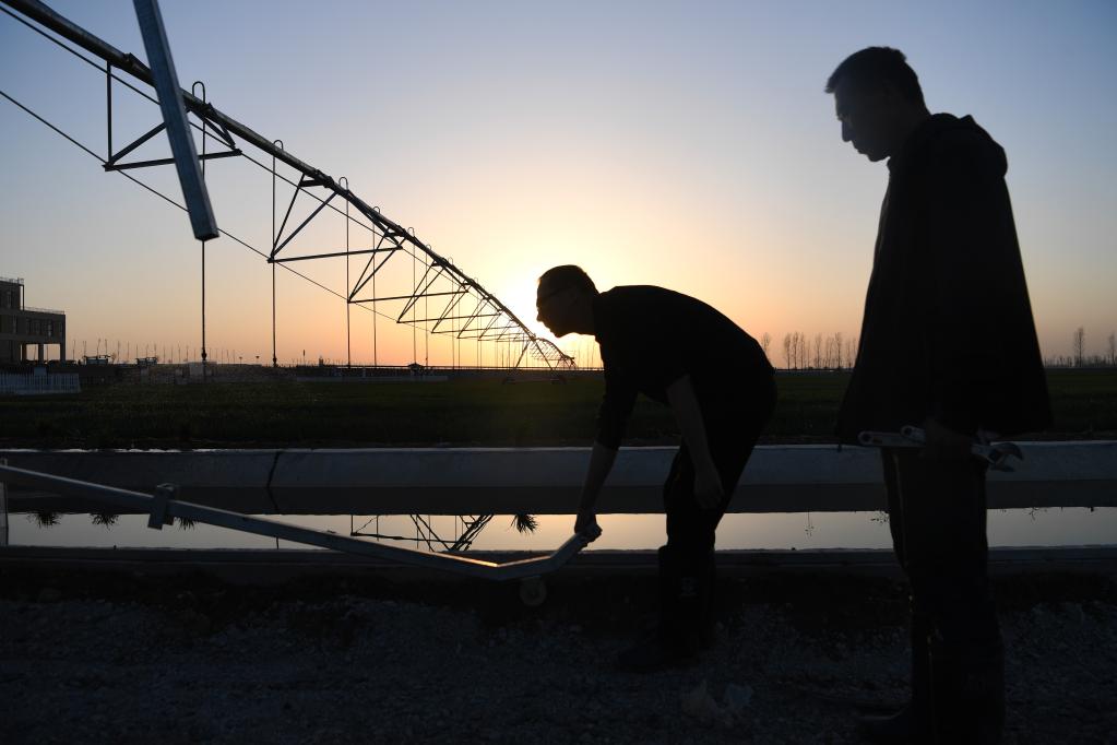 3月14日,在西平縣老王坡高標準農田示范區,劉亞輝(左)在調整噴灌機的移動(dòng)方向。