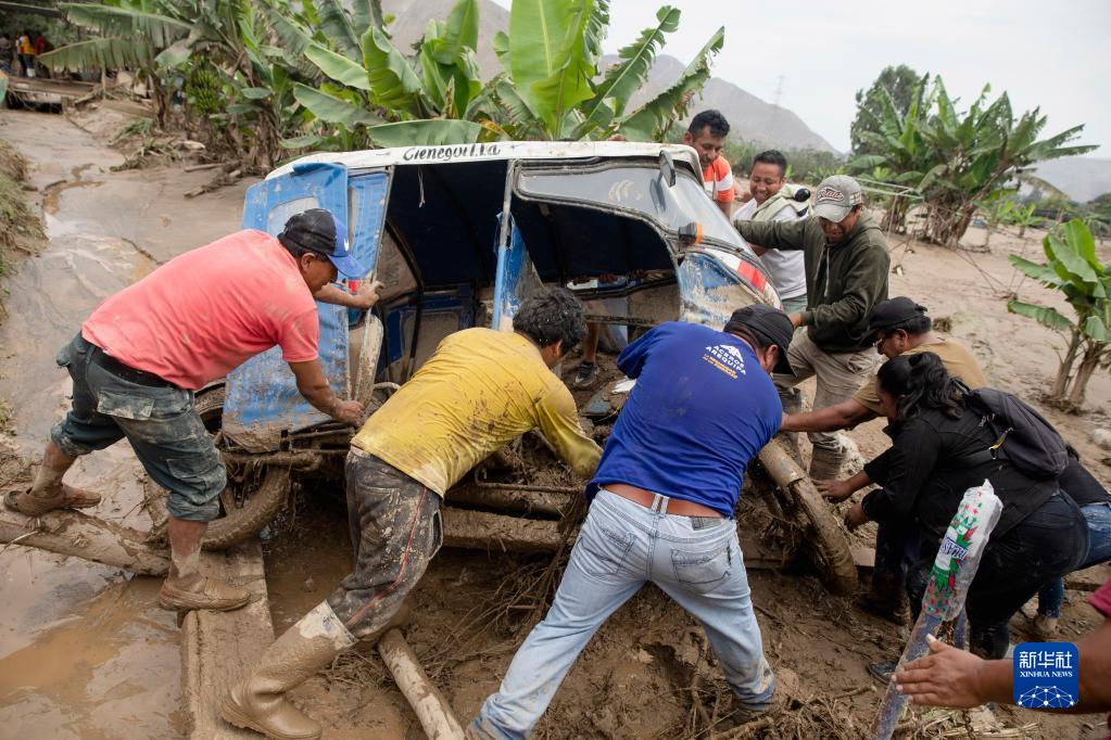 3月15日,在秘魯首都利馬南部的帕查卡馬克區,人們試圖將一輛車(chē)從淤泥中推出。
