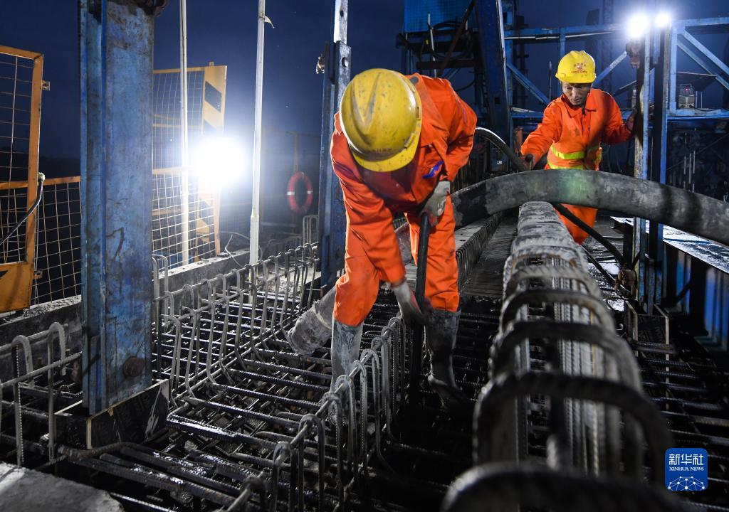 3月18日,在位于四川省瀘州市的渝昆高鐵瀘州沱江特大橋主跨合龍現場(chǎng),施工人員在進(jìn)行混凝土澆筑。