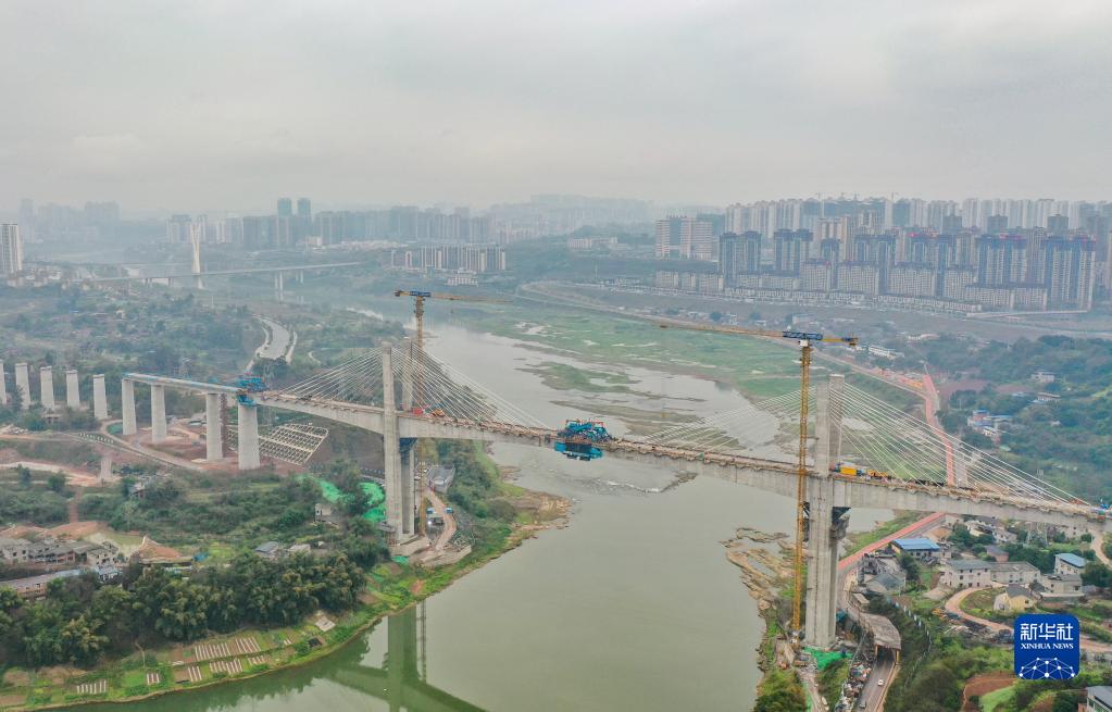 3月18日在四川省瀘州市拍攝的渝昆高鐵瀘州沱江特大橋主跨合龍施工現場(chǎng)(無(wú)人機照片)。