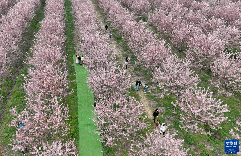 3月18日,游人在全椒縣馬廠(chǎng)鎮龍山櫻花園游玩(無(wú)人機照片)。