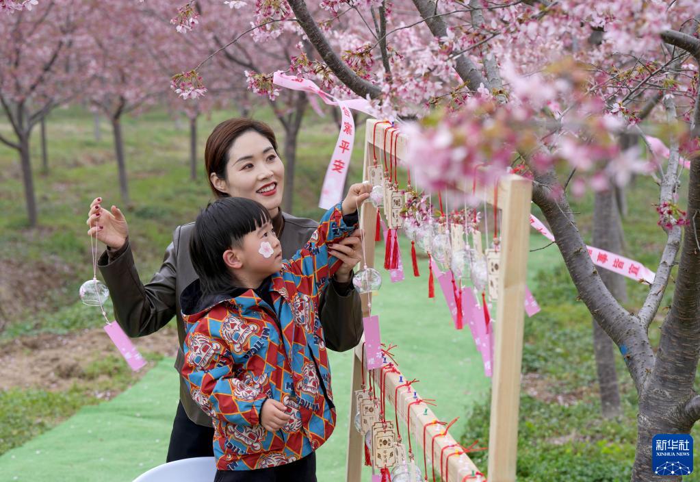 3月18日,游人在全椒縣馬廠(chǎng)鎮龍山櫻花園懸掛風(fēng)鈴。