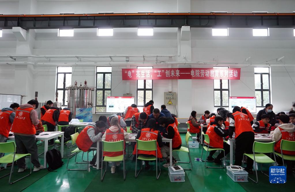 3月18日,在上海交通大學(xué)閔行校區的智能電網(wǎng)大樓,學(xué)生在學(xué)習組裝智能配電箱。