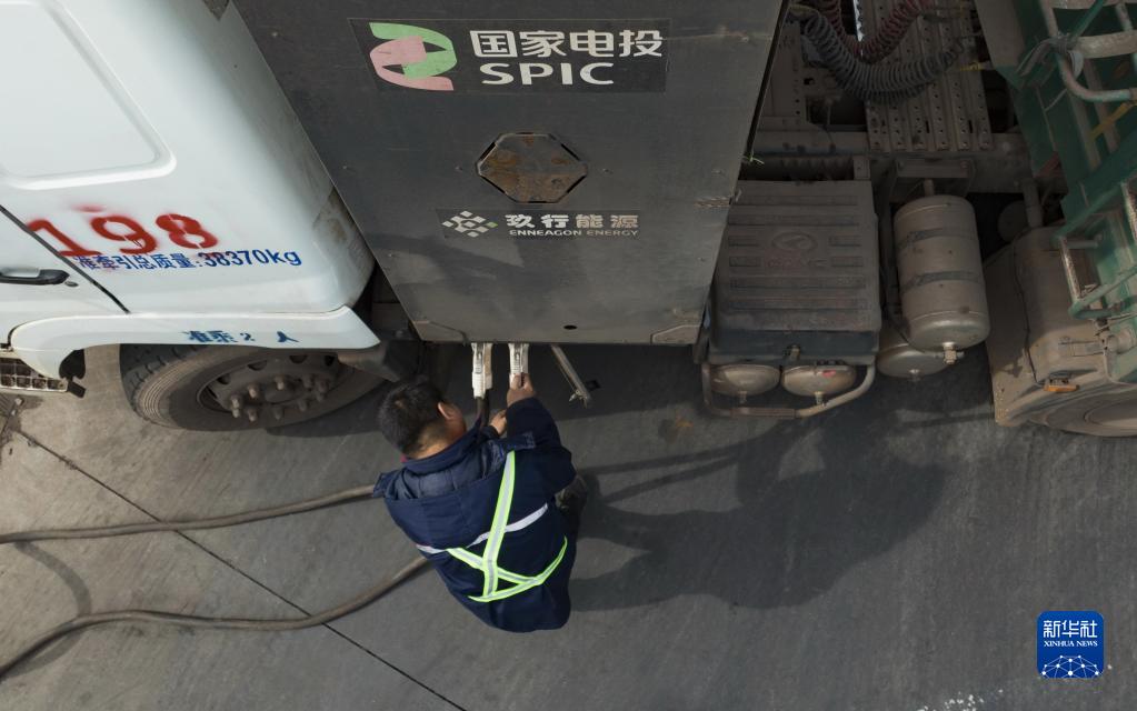 3月18日,唐山市曹妃甸區的一家運輸企業(yè)的駕駛員將電動(dòng)重卡停在唐海鎮充電站給重卡充電(無(wú)人機照片)。