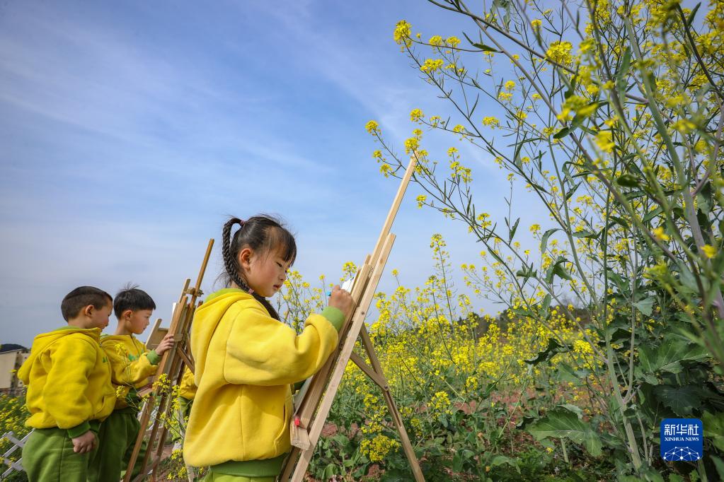 3月17日,大英縣河邊鎮幼兒園的孩子在油菜花海中畫(huà)油菜花。