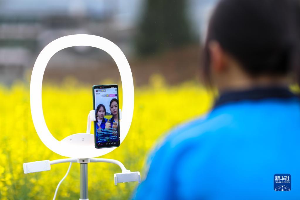 3月18日,岑鞏縣中等職業(yè)技術(shù)學(xué)校電子商務(wù)專(zhuān)業(yè)的學(xué)生在油菜花地里學(xué)習直播銷(xiāo)售蜂蜜。