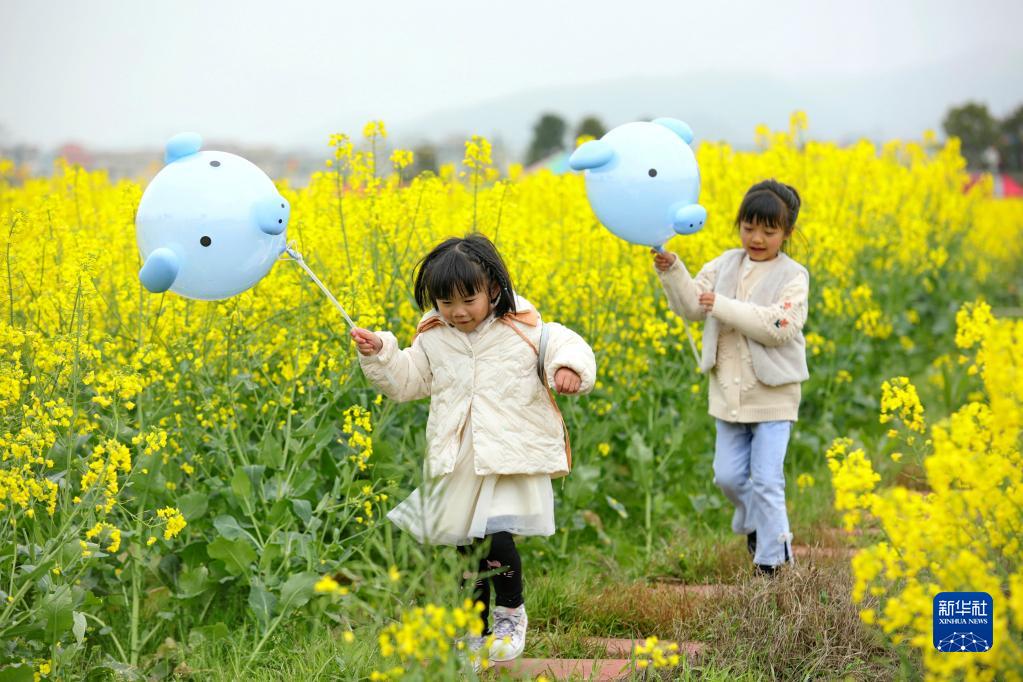 3月18日,小朋友在貴州省安順市平壩區白云鎮平元村花海中游玩。