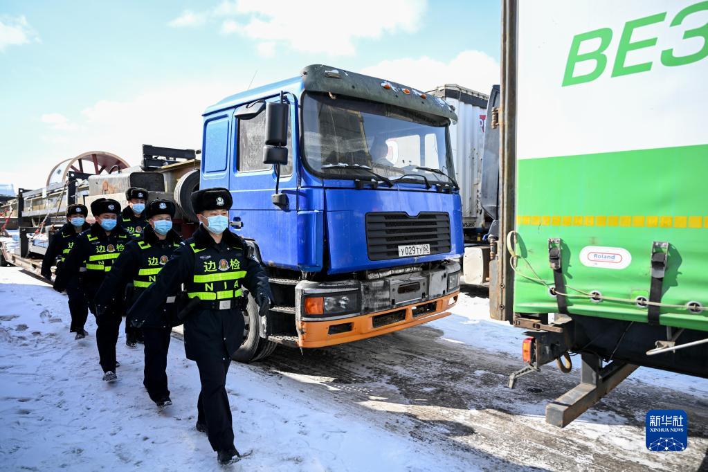 滿(mǎn)洲里出入境邊防檢查站移民管理警察在滿(mǎn)洲里公路口岸巡邏(3月15日攝)。