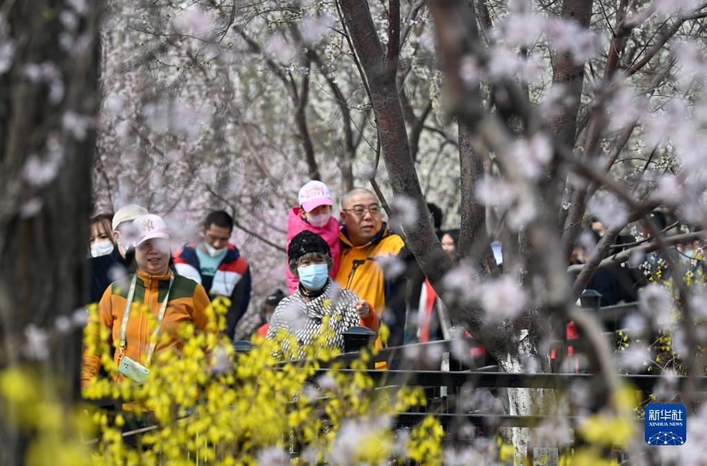 3月19日,游客在天津市紅橋區北運河畔的桃花堤上游覽。