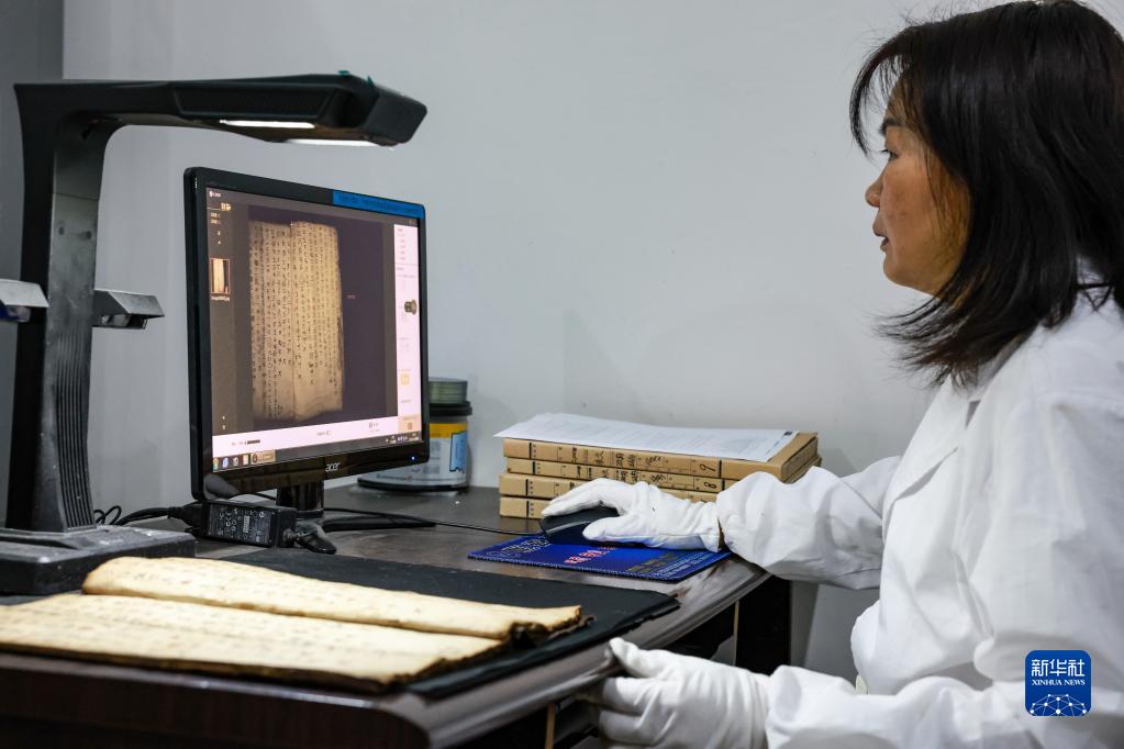 3月8日,荔波縣檔案史志館的工作人員在用掃描儀錄入水書(shū)文獻。