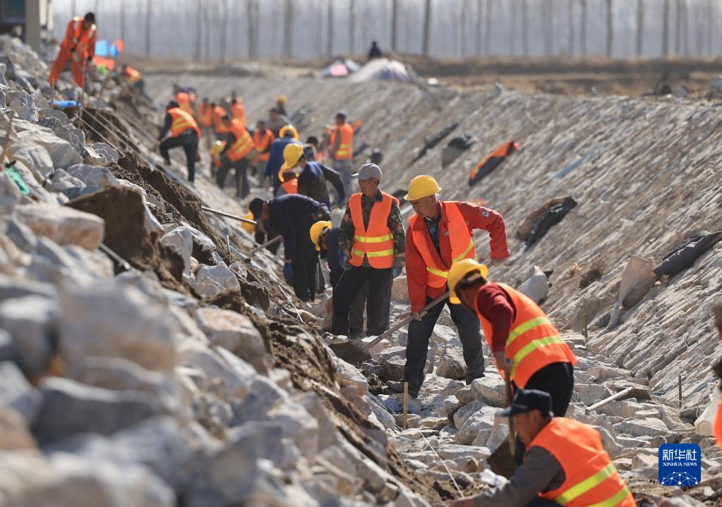 3月19日,工人在唐山市豐南區西葛鎮東尖坨一村高標準農田灌溉水渠改造工地施工。