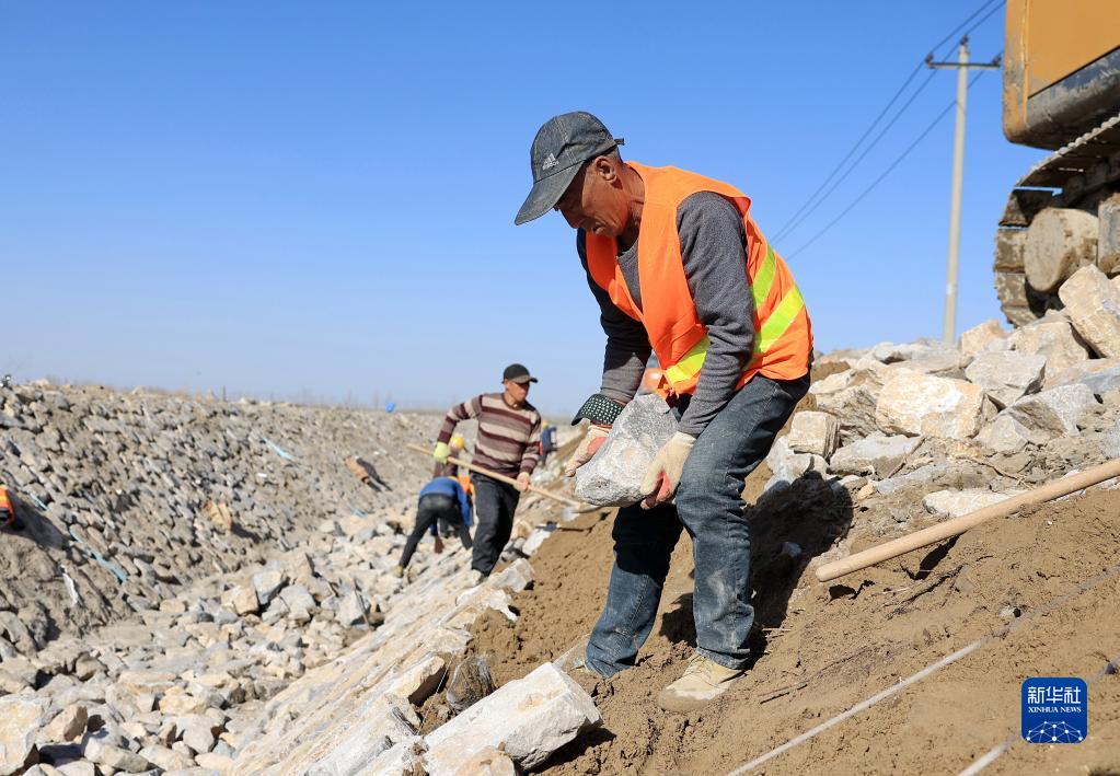 3月19日,工人在唐山市豐南區西葛鎮東尖坨一村高標準農田灌溉水渠改造工地施工。