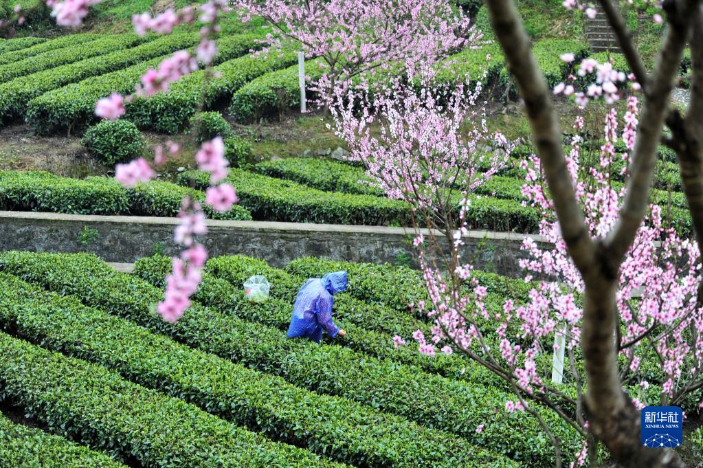 3月18日,湖北省宜昌市夷陵區太平溪鎮村民在桃花滿(mǎn)園的生態(tài)茶園里采摘春茶。