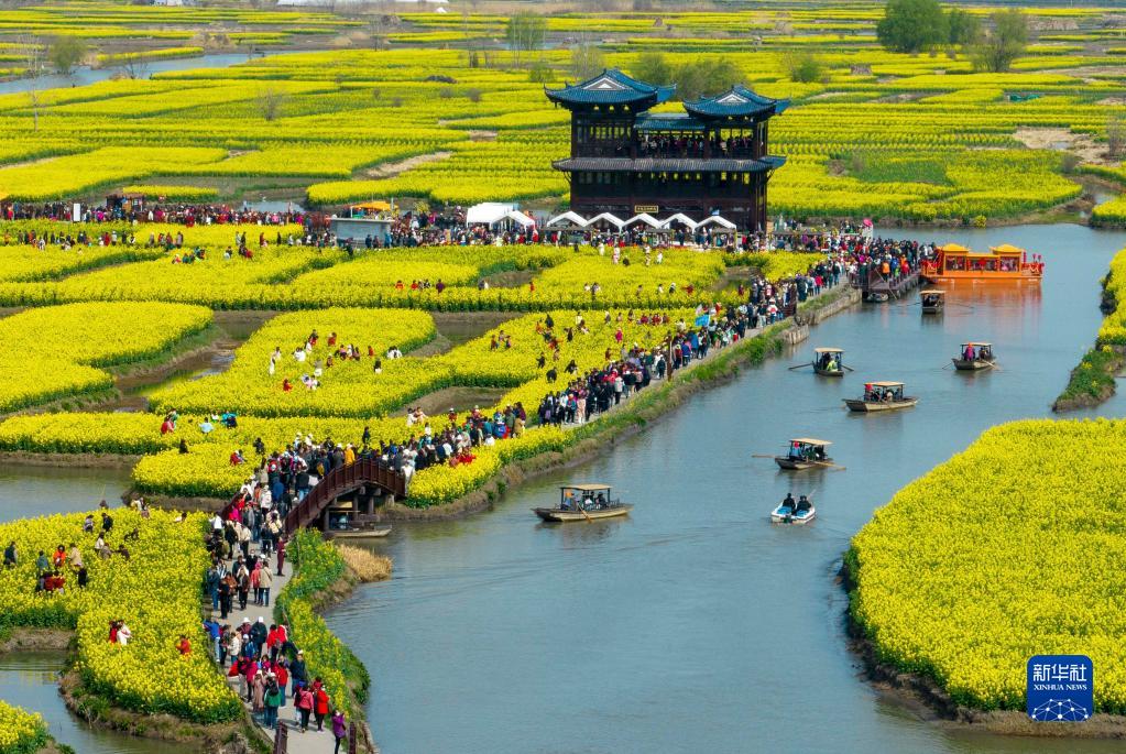 3月19日,游客在江蘇興化千垛菜花風(fēng)景區游覽(無(wú)人機照片)。