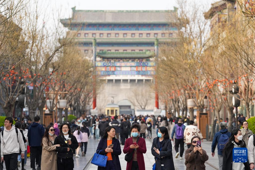 3月19日,游客在北京前門(mén)大街游覽。