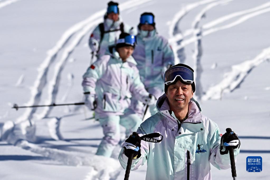 2023年2月7日,松江河森林公安分局雪上巡邏案件偵查大隊的建隊人王建波與隊友們滑雪下山。