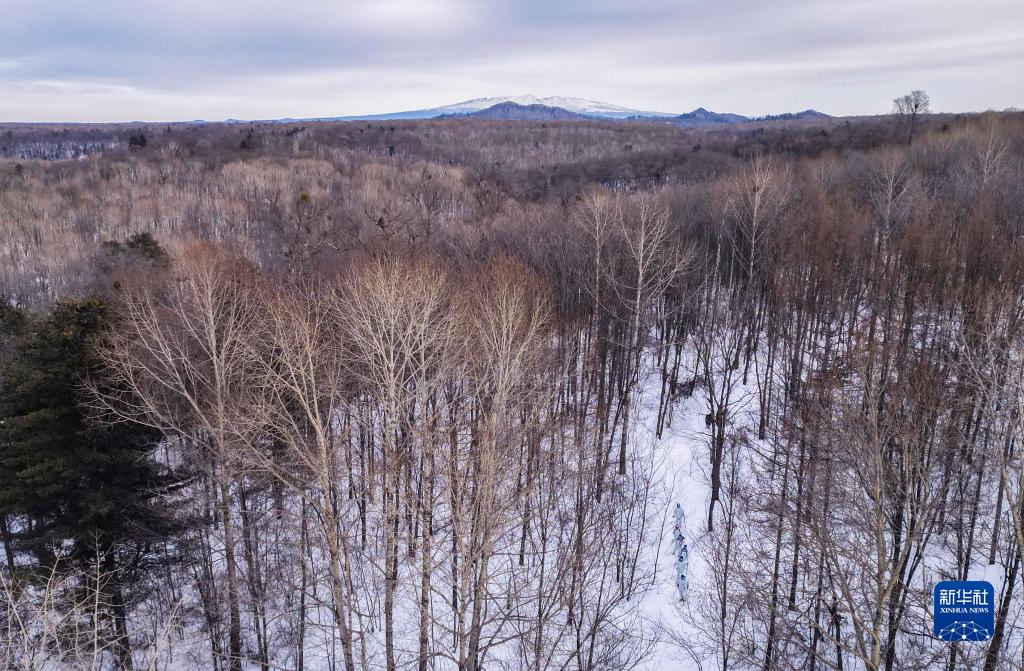 這是2023年2月7日,松江河森林公安分局雪上巡邏案件偵查大隊在林區巡邏,遠處是長(cháng)白山主峰。