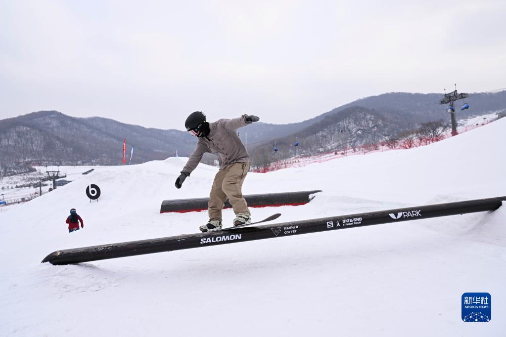這是2023年2月11日,一名滑雪愛(ài)好者在地形公園體驗“呲桿”。