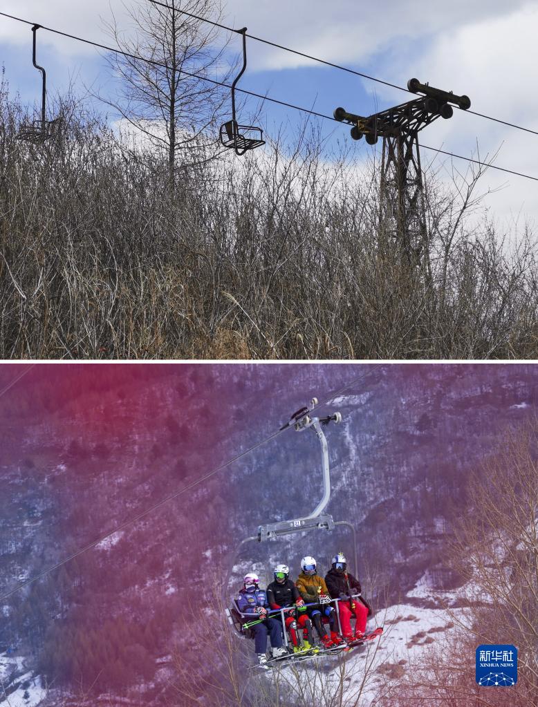 這是一張拼版照片。上圖:這是金廠(chǎng)滑雪場(chǎng)老式纜車(chē)的資料圖片;下圖:2023年2月10日,滑雪愛(ài)好者在萬(wàn)峰通化滑雪度假區乘坐纜車(chē)(新華社記者顏麟蘊攝)。