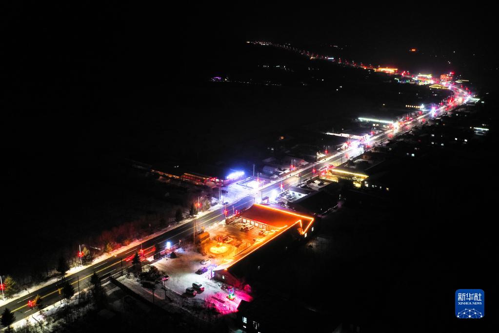 2023年2月11日,夜幕下的吉林市永吉縣北大湖鎮南溝村燈火通明,農家樂(lè )遍布這條通往雪場(chǎng)的公路兩邊(無(wú)人機照片)。