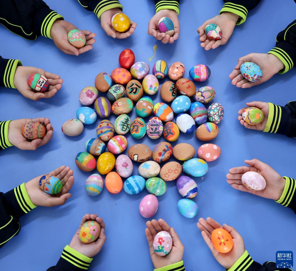 3月20日,在山東省棗莊市江山實(shí)驗學(xué)校,小學(xué)生們在展示繪制的“彩蛋”。