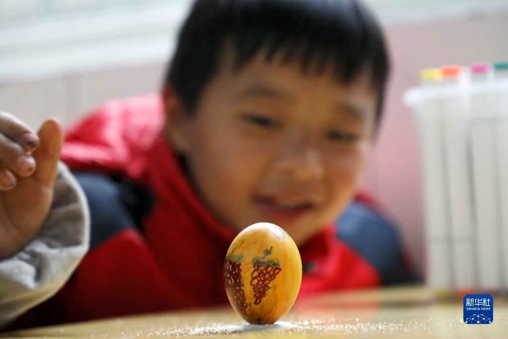 3月20日,在湖南省資興市第一完全小學(xué),孩子們在玩“立蛋”游戲。