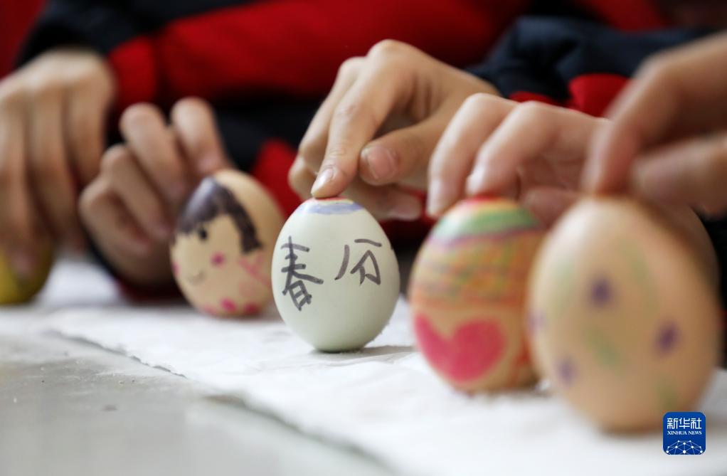 3月20日,在湖南省資興市第一完全小學(xué),孩子們在玩“立蛋”游戲。