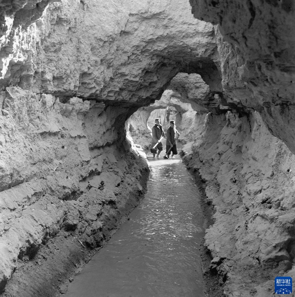 在新疆吐魯番,當地農民正沿著(zhù)地下渠道檢查水流情況,以保證農田生產(chǎn)用水(1963年5月9日攝)。