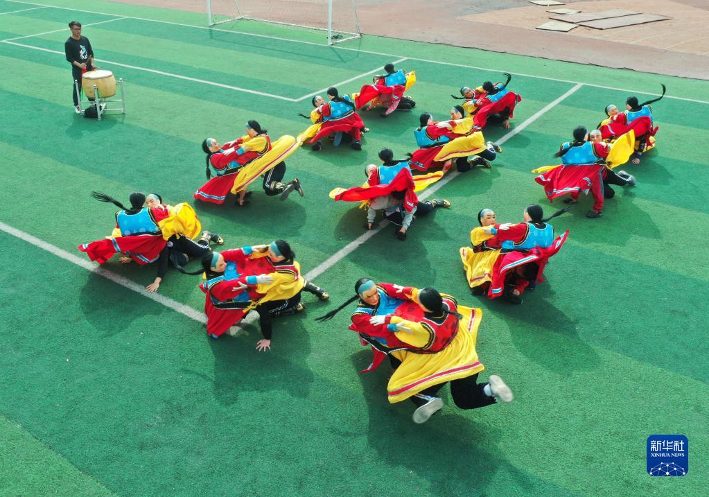 3月20日,隆化縣職教中心學(xué)生在練習國家級非遺項目“二貴摔跤”(無(wú)人機照片)。