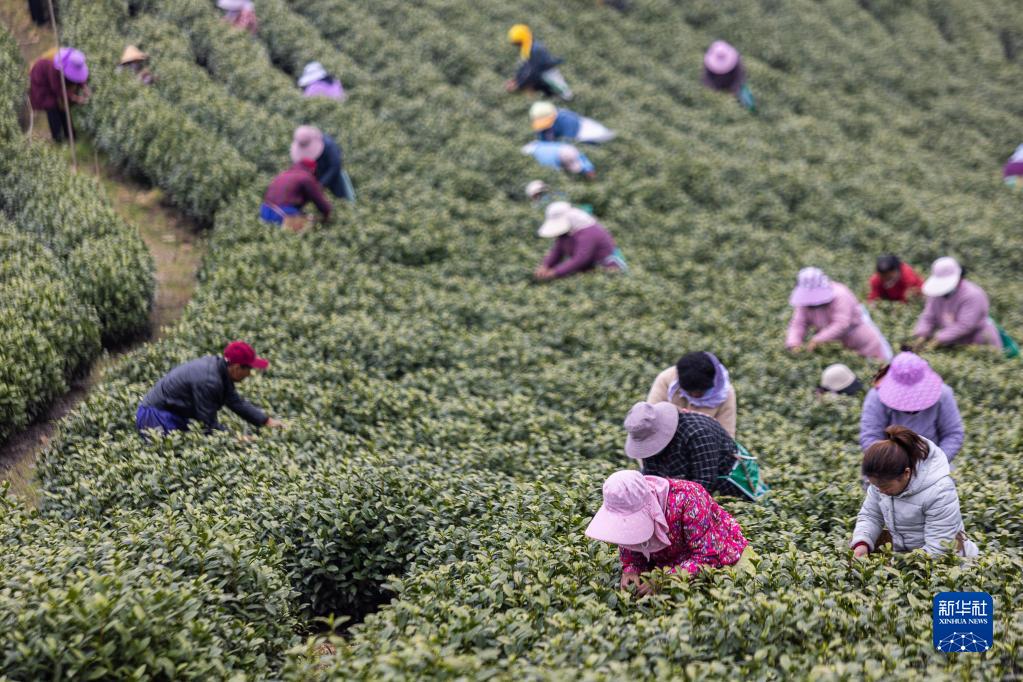 3月20日,在浙江省湖州市安吉縣遞鋪街道湯村塢自然村的高山茶園,工人在采摘茶鮮葉。