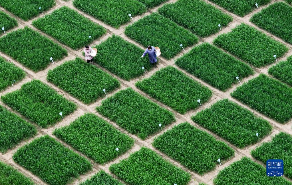 3月20日,在江蘇里下河地區農科所(揚州市農科院),農民在試驗田給小麥施肥(無(wú)人機照片)。